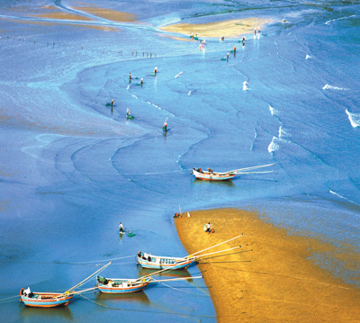 功夫不負有心人。經(jīng)過漫山遍野地毯式的尋覓,鄭德雄一行把霞浦海灘的拍攝點摸了個遍,也拍出了一幅幅漂亮的好作品。那照片上的霞浦真是美?。核{色的海水,金色的沙灘,種海帶的竹竿依序林立,滿載的漁船停泊在靜靜的港灣,趕海人背著沉甸甸的魚簍,正走在金色的沙灘上……