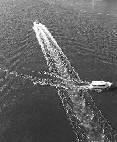 在這張照片里你看見(jiàn)了,天氣晴朗,海水蔚藍(lán),兩船交叉駛過(guò),畫(huà)出如此美麗的浪花。這兩艘游船并不是匆匆過(guò)客,而是相約作一次表演,海域內(nèi)洋溢著歡樂(lè)的氣氛。