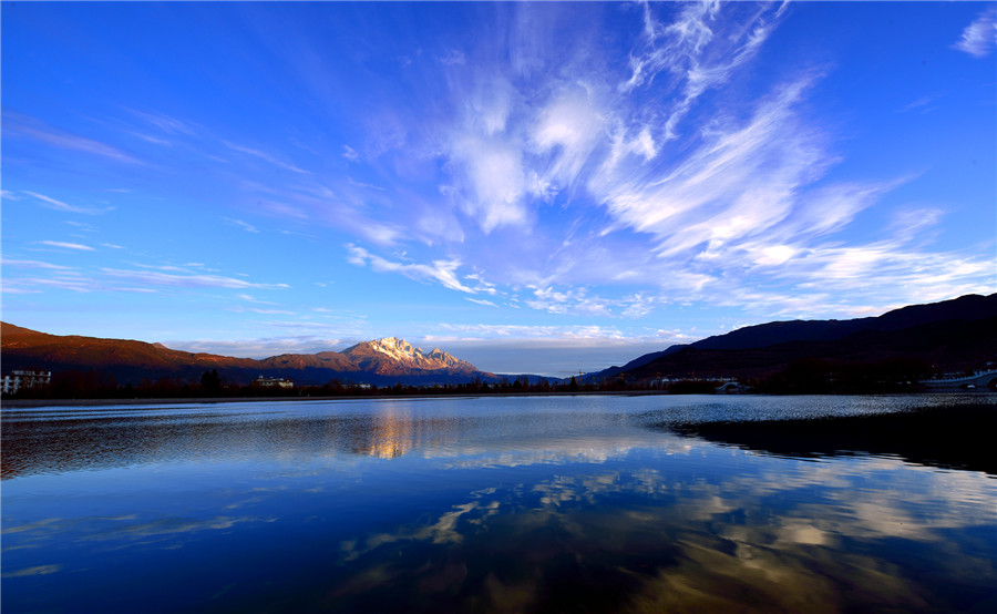 我是被亮光驚醒的。我和很多水從象山腳下的黑龍?zhí)睹俺鰜?。咕咚一聲翻上水面??匆姾芏嗖煌拥娜?。黑頭發(fā)的人,黃頭發(fā)的人。黑眼睛的人,藍(lán)眼睛的人。我看見了潭邊的亭臺樓閣。看見了花與樹。我還順著人們遠(yuǎn)眺的目光看見了玉龍雪山,晶瑩奪目矗立在藍(lán)天下面。潭水映照雪山,真讓人目眩神迷啊。人們在橋上,在堤上,說著不同的語言。在不同的語言里,都有那個詞頻頻出現(xiàn):麗江,麗江。這時的麗江已經(jīng)是一座很大的城了。城里也不是只有最初筑城的納西人了。如今全中國全世界的人都要來麗江,看納西古城的四方街,看玉龍雪山。