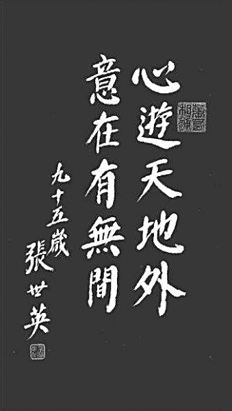 張先生今年正好百歲,照過(guò)去的觀念,當(dāng)然是長(zhǎng)壽了。但是在我們的心目中,張先生現(xiàn)在去世,還是太早了,令我們無(wú)限悲痛!前年(2018年)12月18日,《張世英書法集》出版,我們?cè)谘嗄蠄@56號(hào)院舉行新書沙龍。張先生在會(huì)上講話,講得那么好,講得那么清晰,一個(gè)字不多,一個(gè)字不少。當(dāng)時(shí)張先生已是98歲高齡了。在開會(huì)前我和張先生聊天。我說(shuō):“我感到學(xué)哲學(xué)能使人長(zhǎng)壽。”張先生說(shuō):“我同意你的看法。”為什么學(xué)哲學(xué)能使人長(zhǎng)壽?就因?yàn)檎軐W(xué)學(xué)得好,能使人有高遠(yuǎn)的精神境界,就是張先生書法集里這兩句話:“心游天地外,意在有無(wú)間。”這種高遠(yuǎn)的精神境界,必然使人長(zhǎng)壽。大家常說(shuō):“期之以米,望之以茶。”當(dāng)時(shí)張先生已經(jīng)過(guò)了米壽,我們相信他必然健康地走向茶壽?,F(xiàn)在卻突然去世,不是太早了嗎?