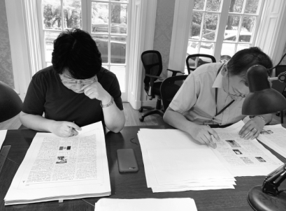 上海辭書出版社社長(zhǎng)秦志華(右)和副總編輯張敏審讀《辭海》(第七版)校樣。