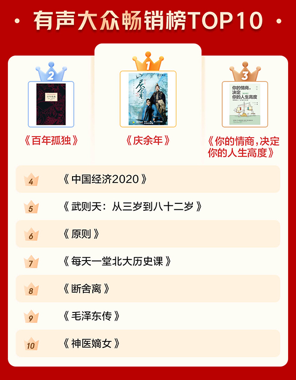 通過電子書暢銷榜TOP10和有聲暢銷榜TOP10可以看出,很多人愈發(fā)關注投資和管理等方面的內(nèi)容,也愈發(fā)注重個人學習?!秲r值:我對投資的思考》《蘇世民:我的經(jīng)驗與教訓》 分別位居電子書暢銷榜第一名和第二名。《中國經(jīng)濟2020》《原則》進入有聲暢銷榜前十。此外,學習類圖書《Python編程:從入門到實踐》《漫畫算法:小灰的算法之旅(Python篇)》也上榜電子書暢銷榜前十。