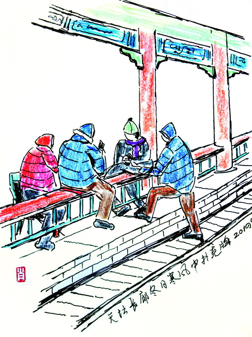 童年時,我家離天壇很近,即便是現(xiàn)在的住所,離天壇也不算遠(yuǎn),地利之便,使我和天壇有種天生的緣分。這種緣分不是一見鐘情,而像長時間接觸磨出來的老繭,結(jié)實(shí)且持久。幾十年來,天壇是我最常去的公園,最近幾年迷上畫畫,更要去那里畫速寫。由于畫畫,身邊總會站著幾個看畫的人,無論褒貶,一定得聊上幾句。以前有人看我畫畫,我老覺得不自在,后來臉皮不僅變厚了,心里還冒出個念頭:如果天天到這里畫畫,可以接觸到好多人,隨手記下各色人等的人生百態(tài),這不是挺有意思的嗎?