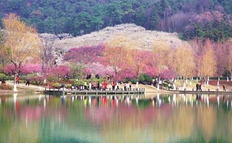 進(jìn)入景區(qū),走過一座石拱橋,眼前,一汪清水,綠意萌發(fā),乃傳說的“鹿女湖”。不時(shí)用手撩撥著拂面的楊柳,沿湖畔小徑繞行數(shù)百米,往上攀登,穿過一個(gè)山口,整個(gè)梅嶺景區(qū),便不驚不乍,呈現(xiàn)在眼前。霎時(shí),我們被如此壯觀的山水梅林驚呆了。清凌凌的湖水邊、亭臺水榭間,依山而栽種的梅樹,紅的、白的、粉的、綠的梅花,競相綻放,層層疊疊、婆娑飛舞,爭芳斗艷、姹紫嫣紅,儼然一幅3D山水畫,仿佛置身“香國仙境”。