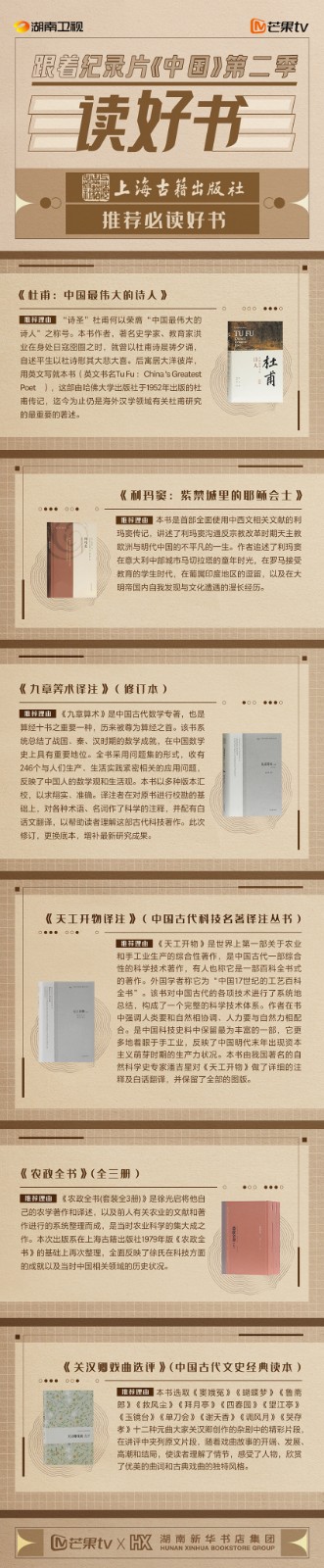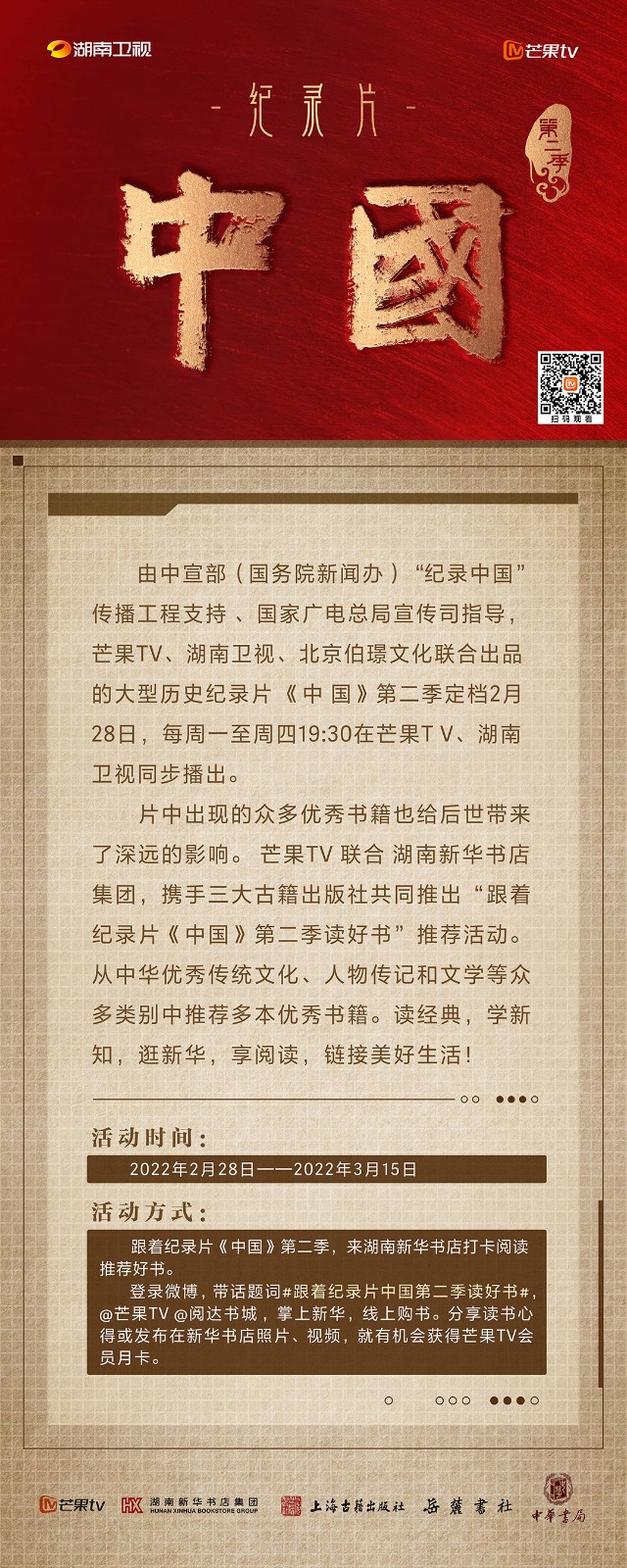 芒果TV以紀錄片《中國》第二季的精美品質,聯(lián)合湖南新華書店集團的美譽口碑,將中華書局、上海古籍出版社、岳麓書社推薦的珍品好書,傾情向大眾推薦。本次“跟著紀錄片《中國》第二季讀好書”活動,將從2月28日持續(xù)到3月15日,湖南新華書店集團旗下湖南圖書城、不吝Boolink書店、全省市級中心門店、長沙地區(qū)樂之書店等全員參與,推薦紀錄片《中國》第二季。書友及觀眾可登錄微博或到線下門店打卡參與活動。