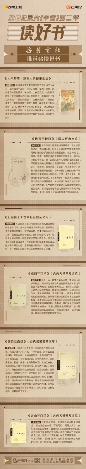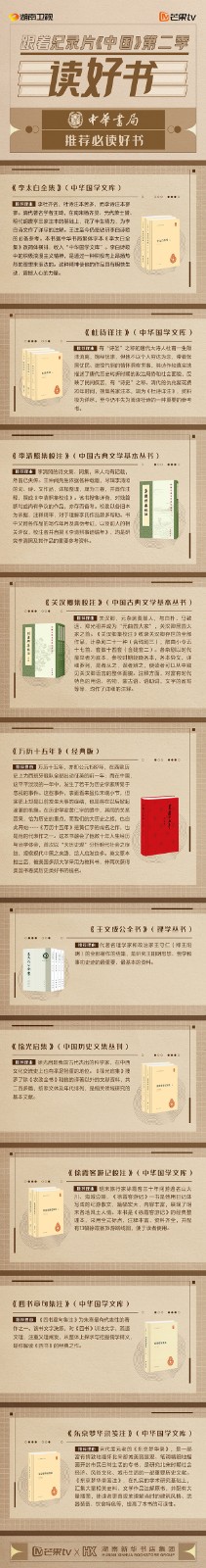 紅網時刻3月7日訊(通訊員 王平)紀錄片《中國》第二季每周一至周四19點30分,芒果TV、湖南衛(wèi)視正在熱播,為了更好地傳播中國故事,讓不朽人物和偉大思想突破影像空間的限制,可知、可感、可觸地融入日常生活,芒果TV聯(lián)合湖南新華書店集團,攜手中華書局、上海古籍出版社、岳麓書社共同推出“跟著紀錄片《中國》第二季讀好書”推薦活動,共享閱讀,鏈接美好生活,傳遞人文情懷。
