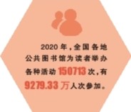 數(shù)據(jù)顯示,全國各級公共圖書館普遍開展講座、展覽、閱讀指導、讀書交流、演講誦讀等活動。僅2020年,各地公共圖書館就為讀者舉辦各種活動150713次,有9279.33萬人次參加。