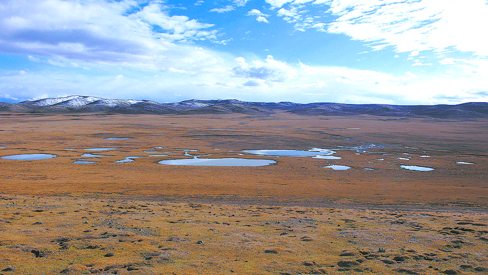 約古宗列位于青藏高原東北部,海拔高度在4200米~4800米,地勢西北高,東南低。站在腳下小泉邊,抬眼先看到的是西面距我們最近的雅合拉達合澤山,它是1952 年新中國第一個河源查勘隊曾認定的黃河源頭山。南望,遠處最高的雪峰,是長江黃河的分水嶺巴顏喀拉山;視線左移,東方藍天白云下,同樣白雪皚皚的是阿尼瑪卿山。以約古列宗為中心輻射,在這東西長約220 公里,南北最大寬150 公里的高山草甸帶與高山草原帶的過渡地帶,東面阿尼瑪卿山阻擋了東南暖濕氣團西進,南面巴顏喀拉山又削弱了溯谷地北進的西南季風勢頭,再加之北面布爾漢布山的屏障作用,把源區(qū)與干旱的荒漠地區(qū)隔開,使這里年平均氣溫在-4℃左右。青藏高原半濕潤地區(qū)氣候和遠處雪山冰川的不斷融化,使母親河上源的兩眼泉和其他那些數(shù)不清的泉,源流不斷,經(jīng)年汩汩。