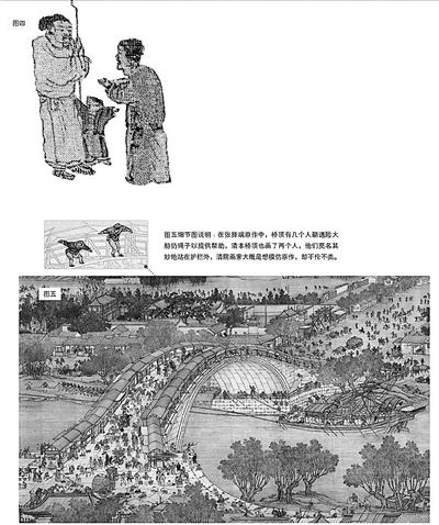 《清明上河圖》在后世有兩種重要的仿本,一個是明代仇英款仿本,一個是清院本。在本文結(jié)束之前,我要以清院本中的虹橋為例,來說明仿本與張擇端原作的一個重要差別。請看圖五,那就是清院本中的虹橋,那橋梁雄偉壯大,氣勢如虹,是吧?再看船與橋的關系,船很大,但桅桿早就放下來,完全可以順利通過。再看那些人物,他們小小的,就像螞蟻。他們像螞蟻,不是因為我們把圖縮得小,實際上,即使放大,也無法看出他們的個性、情緒,換句話說,這些人與其說是人,不如說是一些符號。把人符號化與賦予人物個性,這是仿本與原作的極大區(qū)別,也是我極力推崇原作的原因所在?!肚迕魃虾訄D》,我們就看到這里。(文并供圖/田玉彬)