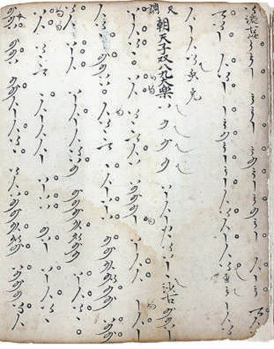 二是音位型曲譜,以各類符號指代樂器上的音位。使用這類曲譜,必須首先明確弦樂器的定弦、定品方式,管樂器的開孔標準和按孔、吹奏方法,才能確定每個音位的實際音高。正因如此,音位譜往往與樂曲宮調(diào)密切相關。同一份譜子,換用不同宮調(diào)演奏,音響大不相同。20世紀初,敦煌藏經(jīng)洞曾發(fā)現(xiàn)一份五代時期的曲譜,采用20個琵琶音位符號記錄,是目前已知這類曲譜的早期代表。