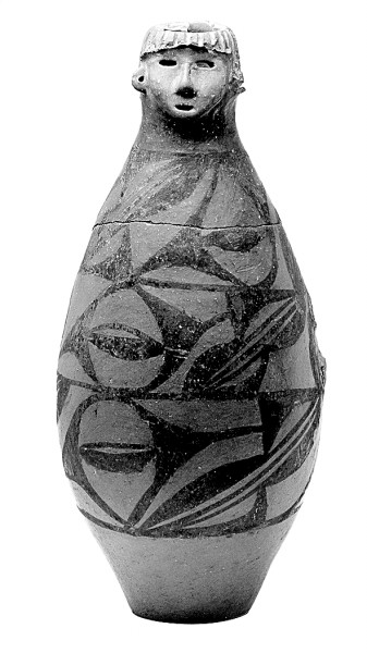 人頭形器口彩陶瓶,仰韶文化,一九七三年大地灣遺址出土。圖片選自《國(guó)寶中的黃河文明》