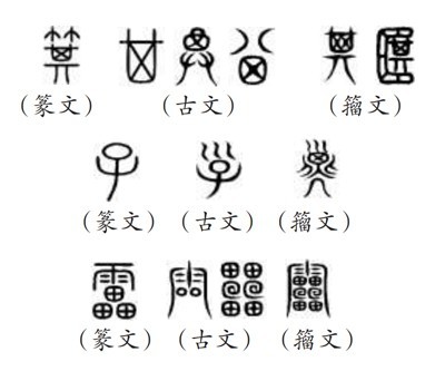 ?。ㄎ澹┧^“9353”,指的是《說文》所收全部正篆,即《說文》分析解釋的全部字?!墩f文》收字以篆文為“正”,作為標(biāo)準(zhǔn)字體,這就是許慎所說的“今敘篆文,合以古籀”的收字原則。“今敘篆文”,就是以篆文(小篆)作為標(biāo)準(zhǔn)正字,同時也會根據(jù)需要收列部分古文和籀文。《說文》所謂“古文”主要是孔子壁中書和民間所獻古文經(jīng)所用的文字,“籀文”即傳為西周晚期太史籀所編字書《史籀篇》上的文字。從《說文》來看,收入的古文、籀文,主要是與篆文有明顯差異的字形。如篆文“箕”“子”“雷”下所收列的古文、籀文: