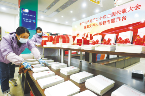 連日來(lái),江蘇省連云港市東??h新華書店精心設(shè)置了黨的二十大重要文件出版物專題展臺(tái),集中展示展銷黨的二十大文件及學(xué)習(xí)輔導(dǎo)讀物,同時(shí)增設(shè)閱讀區(qū),市民可以隨時(shí)閱讀黨的二十大報(bào)告單行本、《黨的二十大報(bào)告輔導(dǎo)讀本》、《中國(guó)共產(chǎn)黨章程》單行本等圖書,吸引了眾多黨員、學(xué)生、市民和機(jī)關(guān)企事業(yè)單位人員等不同群體的讀者前來(lái)閱讀選購(gòu)。