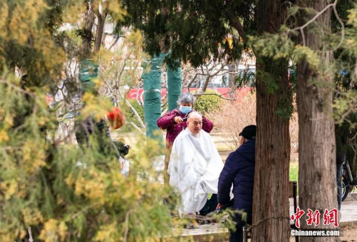 資料圖:北京市民在街頭休閑區(qū)理發(fā)。當天是中國農(nóng)歷二月初二,民間有“二月二,剃龍頭”的傳統(tǒng)習俗,寓意辭舊迎新,帶來好兆頭。 中新社記者 侯宇 攝