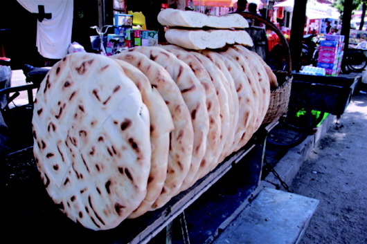 將面粉中加入一定比例的堿水,調和成面團揉入早發(fā)酵好的面團,然后再添入大量干面,接下來才是關鍵所在:用堅硬、光滑、沉重的木頭杠子一頭固定(形如杠桿),一頭人工操作,反復揉壓面團,直到將干面團壓成綢子一樣綿軟,再切成1斤、2斤或3斤的面劑子,搟成圓餅狀,抹上清油,撒上少許鹽和胡椒、苦豆、姜黃等佐料,最后將面餅卷起來,豎立壓制成團,再用木杠搟壓成厚而大的圓餅,并在上面用干凈的梳齒等工具精心旋出花紋圖案,抹少許清油,便可上鏊烘烤。