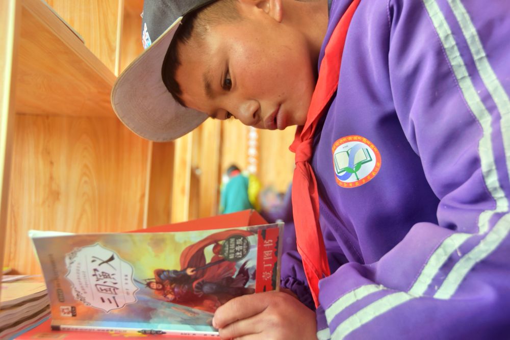 格桑加措的英語(yǔ)老師潘紅培將圖書整理分類,她來(lái)自河南,已在申亞鄉(xiāng)小學(xué)支教兩年多。她說(shuō):“書籍是給孩子們最好的禮物,使孩子們的心靈受到滋潤(rùn)、生活更加美好。有時(shí)候,他們吃飯時(shí)也要帶上書。”