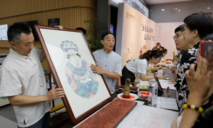 8月22日,在揚(yáng)州市圖書館,雕版印刷技藝代表性傳承人李江民在“古籍里的揚(yáng)州運(yùn)河文化”市集上為市民展示雕版印刷品。