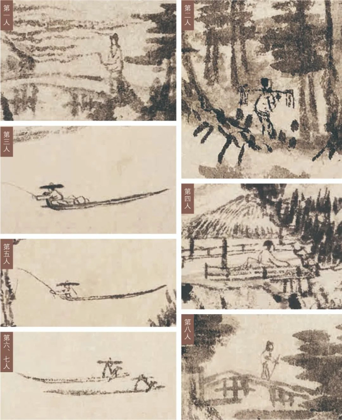 說(shuō)第九位人物之前,我們先來(lái)看看上圖展示的已經(jīng)形成共識(shí)的八位人物。從形象上看,這八位人物大概為高士、樵夫和漁父。詳細(xì)解讀這八位人物之前,我們不妨先一起找尋一下隱藏的第九位神秘人物。