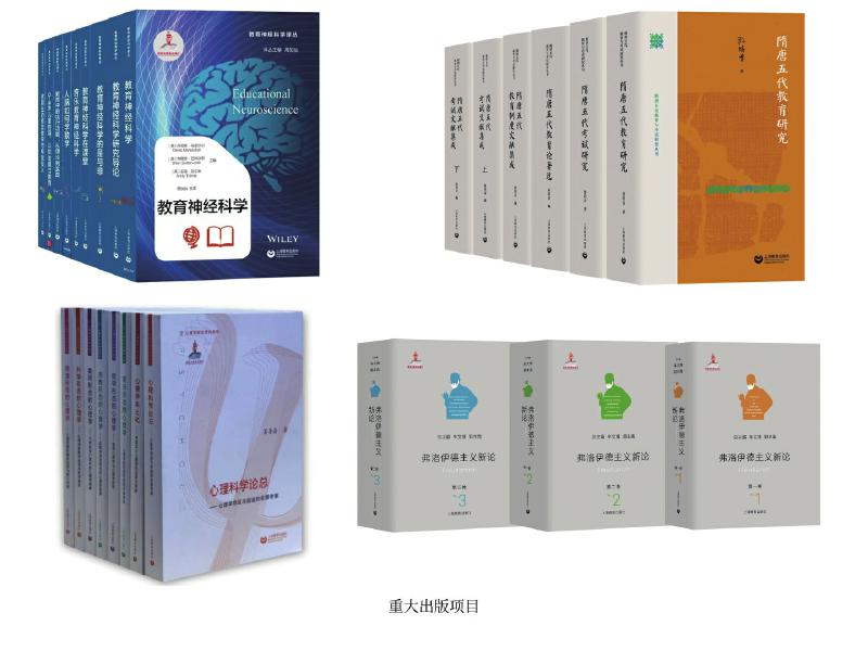 上教社密切關(guān)注新時代教育發(fā)展的重大理論問題與現(xiàn)實(shí)問題,響應(yīng)國家教育發(fā)展戰(zhàn)略需求,精心布局學(xué)術(shù)專業(yè)出版“大項目”,連續(xù)入選國家重點(diǎn)出版物出版規(guī)劃、2013—2025年國家辭書編纂出版規(guī)劃,獲國家出版基金資助。這其中除前文中的大型??乒ぞ邥€包括一系列教育與心理學(xué)原創(chuàng)研究和前沿研究成果:由中國教育史學(xué)者孫培青編著的“隋唐五代教育與考試研究叢書”,構(gòu)建了反映隋唐五代教育與考試全貌的教育理論體系和文獻(xiàn)資料體系,是中國教育史學(xué)科建設(shè)的一項學(xué)術(shù)文化積累工程;《中國課程史》以現(xiàn)代課程理論為分析框架,以歷史線索展現(xiàn)中國學(xué)校課程的新陳代謝;“教育神經(jīng)科學(xué)譯叢”(9冊)是我國首個聚焦教育神經(jīng)科學(xué)這一國際教育研究前沿領(lǐng)域的學(xué)術(shù)譯介系列;《中國傳統(tǒng)德育心理學(xué)思想新論》系統(tǒng)挖掘整理中華優(yōu)秀傳統(tǒng)文化中蘊(yùn)含的德育心理學(xué)思想,構(gòu)建中國特色心理學(xué)話語體系;我國第一套以大心理學(xué)觀,從本土心理學(xué)視角系統(tǒng)探索和解讀不同形態(tài)心理學(xué)的學(xué)術(shù)系列“心理學(xué)形態(tài)研究系列”(6冊),全景考察心理學(xué)的命運(yùn)與前途,深入探索中國本土心理學(xué)的選擇與突破;《弗洛伊德主義新論》(三卷)匯聚國內(nèi)弗洛伊德主義研究領(lǐng)域的權(quán)威學(xué)者,歷史展現(xiàn)弗洛伊德理論的百年發(fā)展歷程,提供弗洛伊德主義研究的“全景圖”。這些重大出版項目為構(gòu)建中國特色自主知識體系,建設(shè)中國教育學(xué)和心理學(xué)學(xué)科體系、學(xué)術(shù)體系、話語體系發(fā)揮了重要作用。