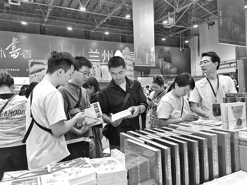 圖為8月22日,以“悅讀時代·共沐書香”為主題的2024蘭州書展開幕,讀者在展位前挑選喜歡的圖書。