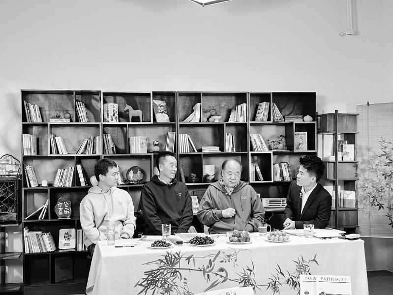 “在文學(xué)的曠野里”特別直播活動現(xiàn)場。從左至右為讀者張志方、《人民文學(xué)》主編施戰(zhàn)軍、作家莫言、“與輝同行”負(fù)責(zé)人董宇輝。 陳濤 攝