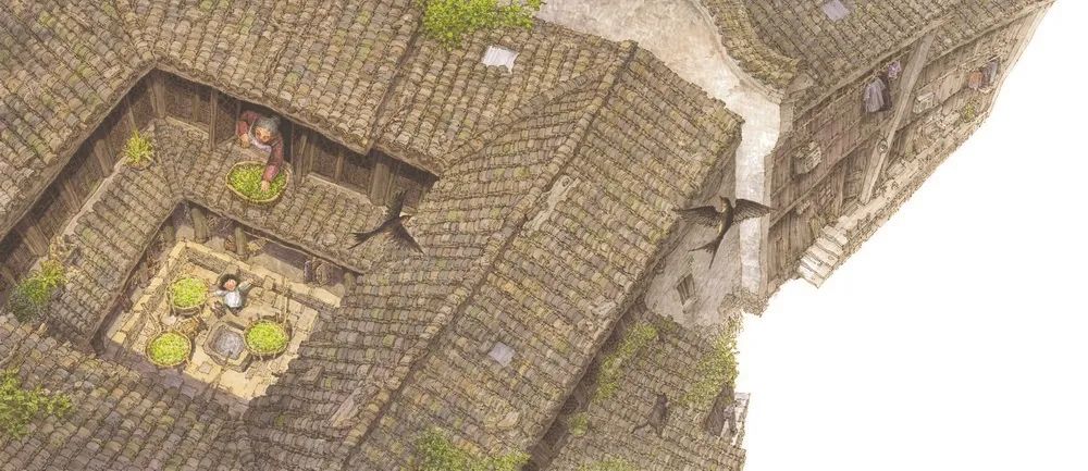 整個繪本主要采用寫實性的現(xiàn)實主義風(fēng)格,繪畫者付出極大的耐心和精力,用鋼筆和馬克筆細(xì)致描繪每一片磚瓦、每一塊石板、每一叢花葉、每一扇門窗,甚至每一條木紋、每一絲波紋、每一道皺紋……力求真實地呈現(xiàn)物像的肌理和質(zhì)感,讓人身臨其境。同時,也加以寫意的手法,用柔和的淡彩渲染懷舊的色調(diào)和溫馨的氛圍。尤其值得稱道的是,在多幅畫面中,以丫丫等待的“神秘的客人”——燕子為一種符號角色,無論之于畫面還是主旨,都有其獨到的意義。燕子飛翔于水面和屋宇之上,給靜態(tài)的環(huán)境帶來靈動之感,有時還能平衡畫面的結(jié)構(gòu)。燕子是江南春天的使者,也是童年喜愛的精靈。蘇軾和歐陽修各自的《蝶戀花》詞中都寫到了燕子,前者是:“花褪殘紅青杏小。燕子飛時,綠水人家繞。”后者是:“畫閣歸來春又晚。燕子雙飛,柳軟桃花淺。”這一古典意象在繪本畫面中的反復(fù)出現(xiàn),羽翼間展開了江南的典雅、清麗以及輕愁。作品里的另一種動物是時??M繞主人腳邊的貓咪,增添了祥和的家居趣味,也代表一種熟稔的情感皈依。原本黑瓦白墻的江南民居在畫面中作為背景或前景,灰中帶彩、冷中帶暖,既體現(xiàn)了時間的流逝,也象征著永恒的家園。外公背著丫丫雨夜歸家的場景以多個連貫畫面變換角度來鋪展,暗夜中始終有溫暖的燈光照亮回家的路,也有堅實的后背托舉稚嫩的夢,給孩子以安全、安穩(wěn)和安心。