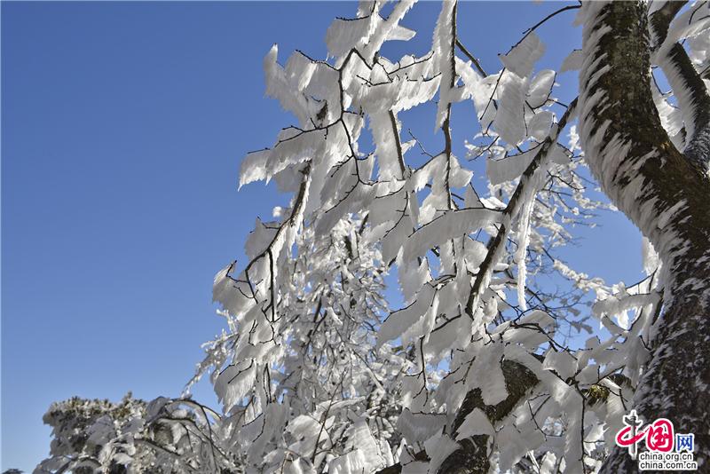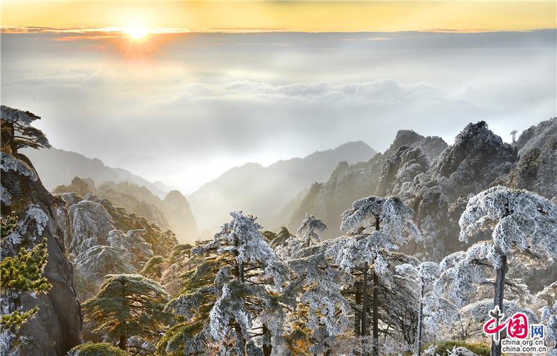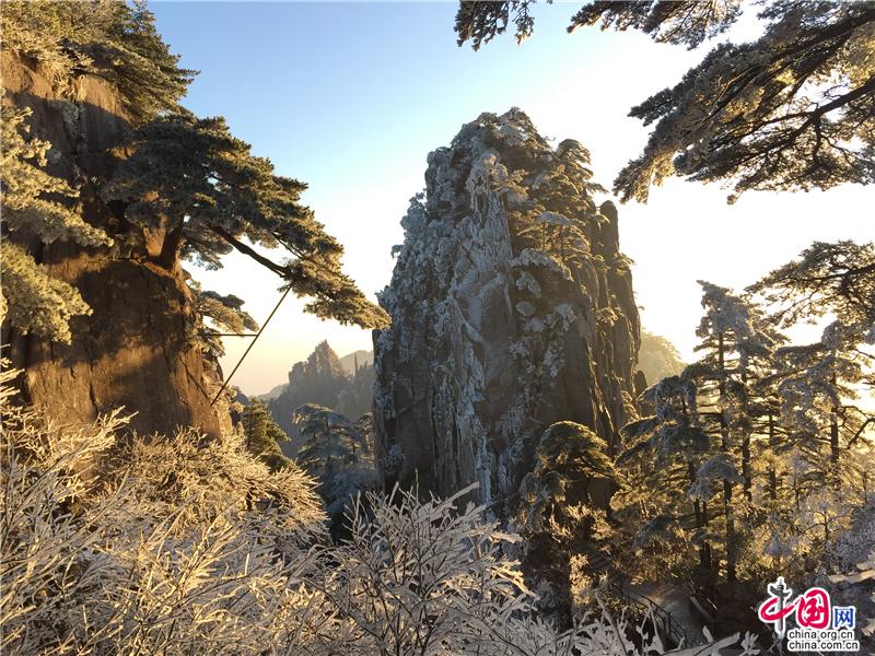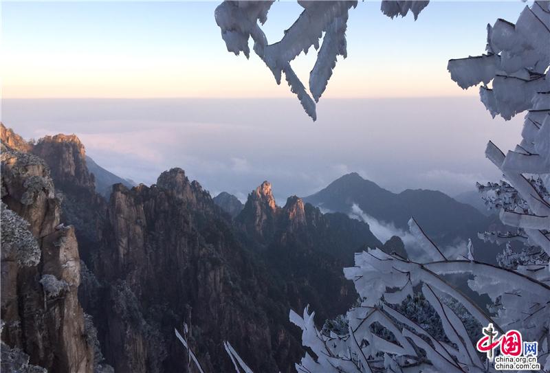 2019年最后一天黃山風景區(qū),出現壯觀的日出、霧凇、云海景觀,到處銀妝素裹,冰雕玉砌,“一夜寒風起,萬樹銀花開”,置身其間,仿佛進入撲朔迷離的童話世界,給來山的游客帶來意外的驚喜。