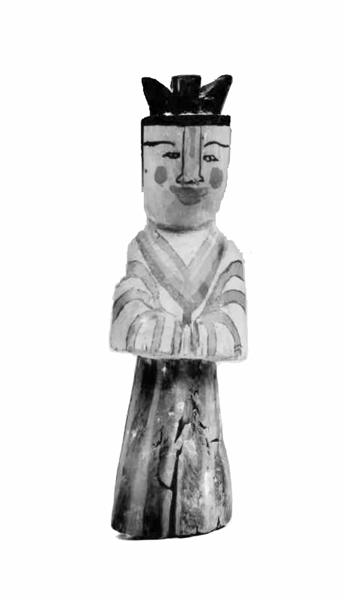 這個(gè)木俑,打扮著一副明星相:她雙手執(zhí)禮,頭發(fā)結(jié)為三環(huán)髻。工匠們只是簡單地雕刻出了木俑的大體形狀。然后用墨線勾勒出了眉、眼、鼻,用紅色裝飾出鼻梁、嘴唇、臉頰;又用紅黑兩色繪制出衣服。