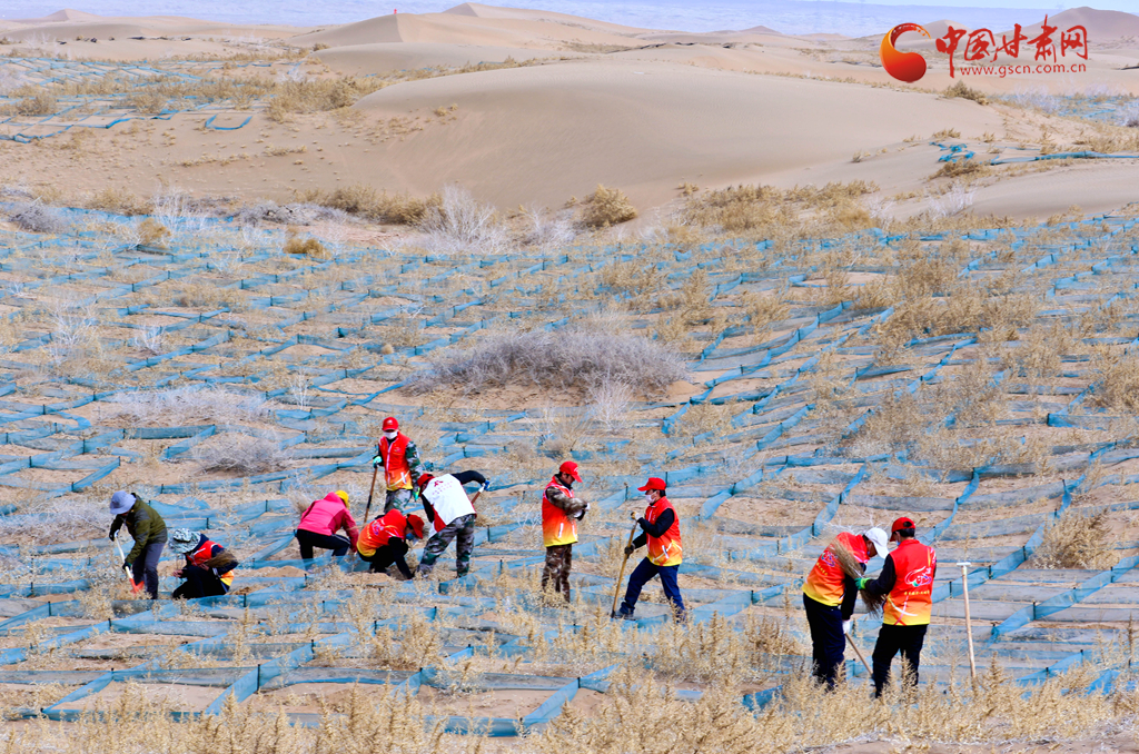 當(dāng)日,張掖市臨澤縣市民來到平川鎮(zhèn)一治沙區(qū)義務(wù)壓沙障、栽梭梭,拉開了造林3.64萬畝、防沙治沙3萬畝年度改善生態(tài)環(huán)境“接力賽”的帷幕。