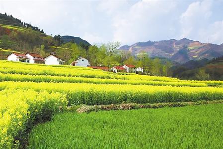 山巒蠢蠢欲動起來,卻比不過一些趕著腳步的植物,或許,它們還要頹敗一些時日。山腳處的田間,一片片油菜花泛動金色的光芒,為山巒繡上彩色的裙邊,散落在田壟之中的農(nóng)舍瓦屋靜默在時光里,安逸、祥和,讓人向往。