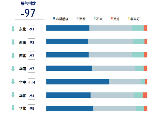 《報(bào)告》稱(chēng),受疫情影響,全國(guó)各地對(duì)于旅游到訪目的地的景氣預(yù)期同樣極度消極,7大地區(qū)市場(chǎng)的平均景氣指數(shù)跌至-97。其中,受疫情影響最為嚴(yán)重的華中地區(qū)景氣指數(shù)最低。同樣的,目的地景氣指數(shù)也表現(xiàn)出疫情影響越嚴(yán)重,指數(shù)表現(xiàn)越低的趨勢(shì)。