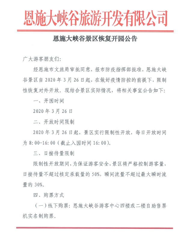 恩施大峽谷旅游開發(fā)有限公司今天發(fā)布《恩施大峽谷景區(qū)恢復(fù)開園公告》(以下簡(jiǎn)稱《公告》),2020年3月26日起,恩施大峽谷景區(qū)恢復(fù)開園。值得注意的是,恩施大峽谷將實(shí)行限制性開放,每日開放時(shí)間為8:00-16:00(截止入園時(shí)間16:00)。