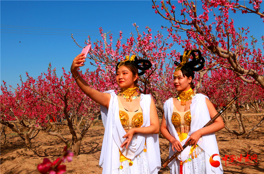 2020年4月22日,敦煌“飛天”在甘肅省敦煌市七里鎮(zhèn)杜家墩村的桃園中拍照。