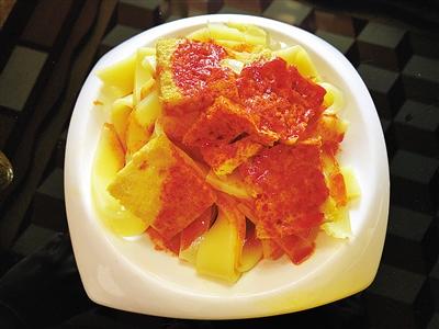 炕鍋洋芋是臨夏農(nóng)家樂(lè)里面常見(jiàn)的一道特色小吃,在臨夏,煎、烙之類(lèi)的烹飪方式都被稱(chēng)作炕,炕鍋洋芋因此得名。洋芋切片后,直接放熱油中兩面煎透??诲佈笥蟮淖龇m不復(fù)雜,但其對(duì)于火候的要求卻極其嚴(yán)苛,多一分會(huì)焦,少一分則不熟。