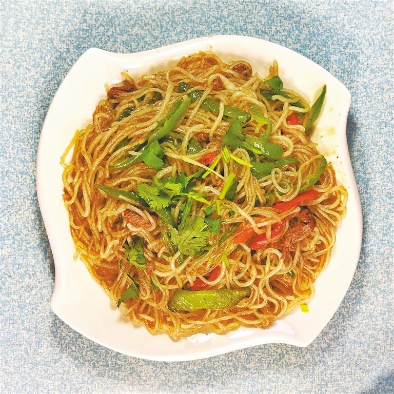肉末粉條的做法簡單,但要炒出好吃的味道來卻沒有那么容易,在折橋灣農(nóng)家院里,肉末粉條要數(shù)最搶手的一道家常菜。在鍋中倒入油,待油熱之后加入肉末翻炒,再加入生姜、大蒜、耗油、醬油,炒出香味后,加入清水煮開并倒入粉絲,然后進行收汁出鍋,最后撒上一點香蔥點綴,肉末粉條就做好了。這道菜肴顏色紅亮,水粉爽滑勁道,口味微辣咸香,食之別有風(fēng)味,讓人食欲全開……