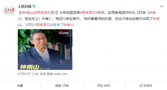 不過,他沒想到,今年全國Ⅲ卷高考語文題中,實(shí)用類閱讀材料為《對話〈鐘南山:蒼生在上〉作者》。有四川考生表示,“我印象最深刻的是,在這次考試試卷中出現(xiàn)了鐘南山。”