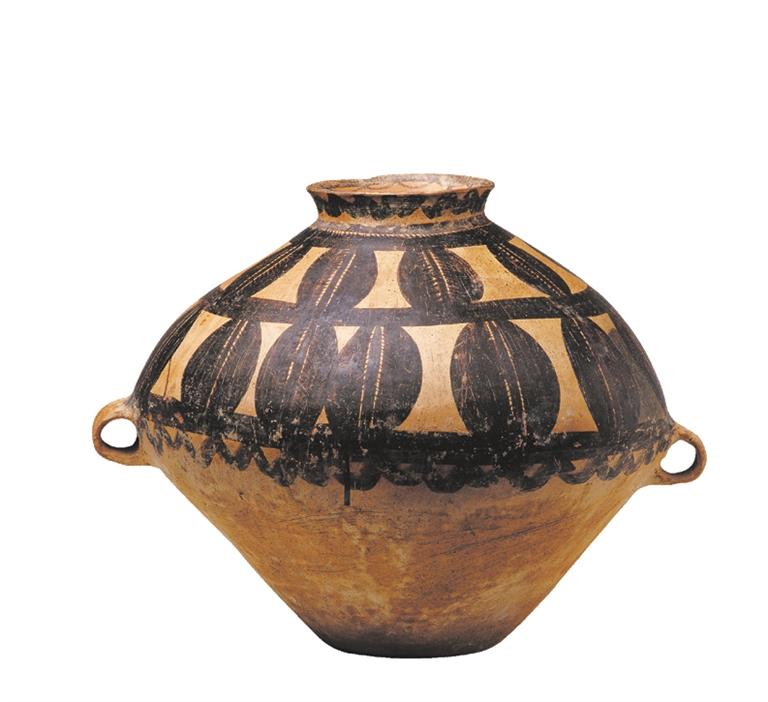 馬家窯文化半山類型(距今約 4500 年),廣河縣地巴坪出土。這是雙耳甕器型大氣貴重,施以紅、黑二彩,紅、黑彩交替使用,腹部繪多層連續(xù)垂弧紋和鋸齒紋,黑、紅彩交替使用,由三組分層連續(xù)的垂弧紋組成整體圖案,每層由兩層黑色帶紋和一層紅色帶紋組成,黑色帶紋上緣繪向上的鋸齒紋。整個(gè)圖案密集繁復(fù),俯視猶如一朵盛開的鮮花,造型豐滿,色彩鮮艷。