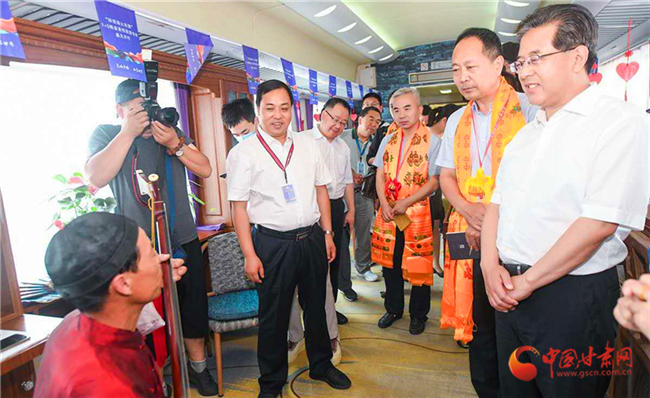 專(zhuān)列到達(dá)西安南站后,陜西省文旅廳及文旅相關(guān)部門(mén)對(duì)“環(huán)西部火車(chē)游”專(zhuān)列的到來(lái)表示熱烈的歡迎,陜西省文旅廳負(fù)責(zé)人在甘肅省委宣傳部副部長(zhǎng)、省文旅廳黨組書(shū)記、廳長(zhǎng)陳衛(wèi)中和武威市文體廣電和旅游局負(fù)責(zé)人的陪同下參觀了“環(huán)西部火車(chē)游”武威館,并欣賞了國(guó)家級(jí)非遺項(xiàng)目“涼州賢孝”表演。