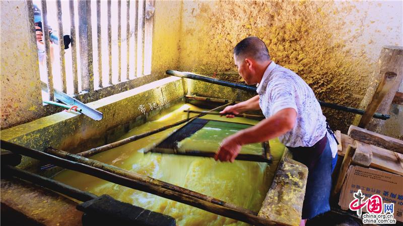 隆回縣灘頭鎮(zhèn)桃林村手工抄紙作坊,已經(jīng)成為一處著名的文旅項目景點。走進陶林村,一棟棟青瓦石墻的新屋吸引了人們的目光。屋外山坡竹林茂密,山溪流水潺潺,屋內(nèi)手工抄紙制作的原料、工具布置的次序井然,手工抄紙的全套工藝流程在這幾棟屋中得以完整體現(xiàn)。手工抄紙技術(shù)歷史悠久,始于隋唐,至明朝時抄紙已經(jīng)非常盛行。上世紀八十年代鼎盛時還曾遠銷東南亞和日本。非遺傳承人李志軍今年61歲,自稱“紙蟲”,帶領(lǐng)著全家人承襲著祖宗留下的獨特技藝。而支撐著李志軍的堅守的,是隆回縣文旅部門的巨大付出和努力。2011年,他們支持李志軍建立了手工抄紙標準化作坊,2016年又對該作坊進行擴建,使之成為國家級非遺項目。灘頭手工抄紙作坊占地面積1714平方米,是灘頭手工抄紙有史以來最大的作坊,同時也是集生產(chǎn)、創(chuàng)新、傳承、展示、研學為一體的重要基地和文旅基地。
