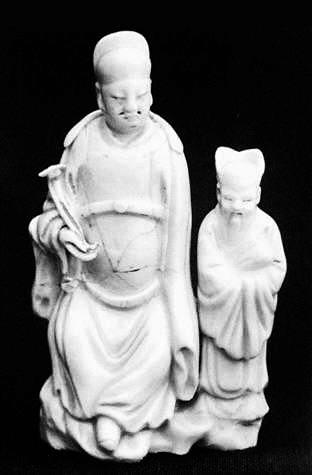 這件白瓷供養(yǎng)人像,為德化瓷人物像,釉面為純白色,色澤光潤明亮。整件雕塑由兩個人物構(gòu)成,一大一小,一主一副。主像高13.7厘米,身穿典型的明代服飾,人物端坐在山石上,衣著瀟灑,神態(tài)自然從容,盡顯雍容華貴,而手執(zhí)如意則似乎暗示著他內(nèi)心的向往和追求。整個構(gòu)圖自然放松,給人一種輕松的感覺。小人物則是長髯飄灑,笑容和藹可親,似乎帶著點職業(yè)習(xí)慣的微笑,雖然年紀(jì)比較大,但卻處于仆從的位置,手里還抱著一卷書。從一個側(cè)面烘托出了年輕主人的身份。