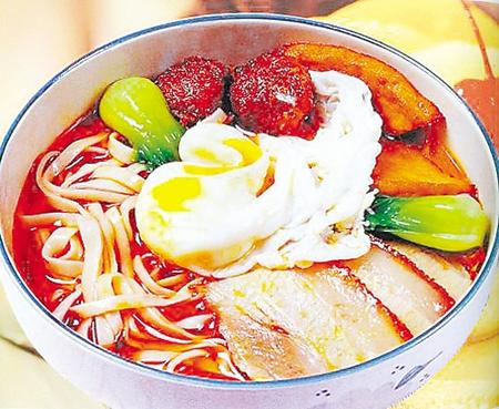 其實(shí),桃花面指的不是面條,而是面條的配料,亦如我們的“牛肉面”“臊子面”中的“牛肉”和“臊子”。不同于“牛肉”和“臊子”的是,桃花面中的“桃花”亦不是枝頭的那片美艷,而是擺在碗中面條上的一片誘人口水的燒肉、一個(gè)金黃的丸子、一個(gè)白白嫩嫩的荷包蛋外加幾根青翠怡人的菠菜。在碗口這個(gè)不大的天地間,綠的是新芽,黃的如花蕊,相間在紅肉白蛋里,自然有了桃花的寫意,故名“桃花面”。