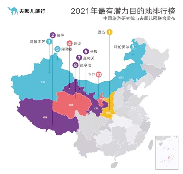 中國旅游研究院與去哪兒網(wǎng)課題組根據(jù)旅游目的地2020年和2019年的預訂增量、平均價格、出行時間和搜索熱度,發(fā)布2021年最有潛力目的地排行榜和2021年小眾旅游目的地排行榜。其中前十位的目的地包含我省敦煌、張掖、嘉峪關三座絲路名城,今年西北地區(qū)將在2021年吸引更多游客前往。
