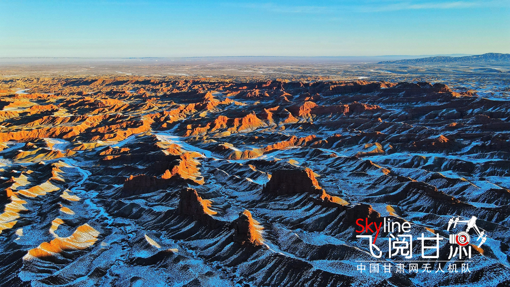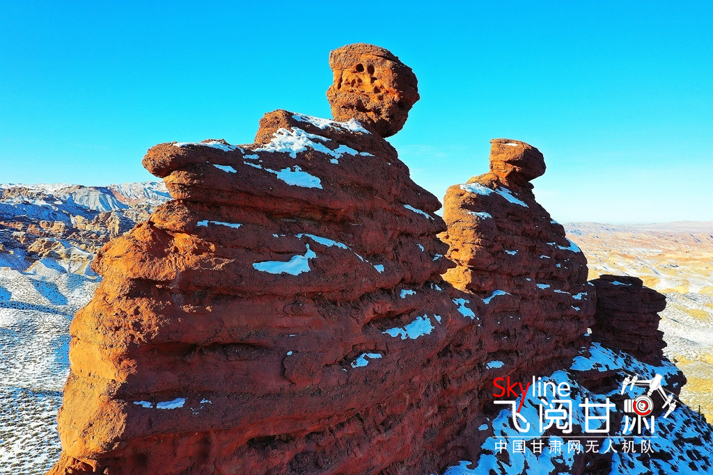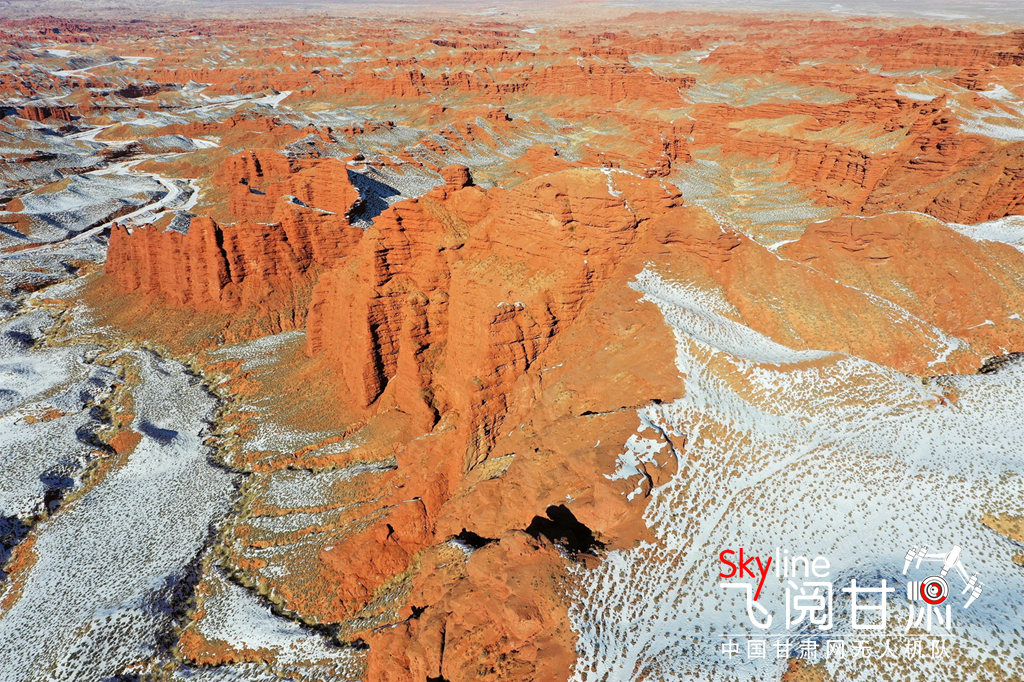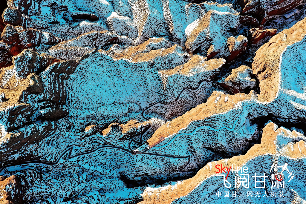 12月26日,俯瞰大雪覆蓋的甘肅省張掖平山湖大峽谷景區(qū),銀裝素裹中顯露出褐色丹霞,宛如一幅美麗畫卷,吸引眾多的游客踏雪賞景。(無人機(jī)照片)