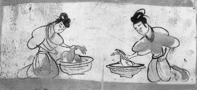 燙雞圖壁畫磚就出土于5號墓葬,這是繪制在一塊單塊磚面上的壁畫,磚面上用刷得甚薄的含膠白堊土作底,正中繪制二婢相對跪坐,袖子高高挽起,眉毛微撇,聚精會神地在各自的盆內(nèi)燙雞去毛。左邊盆內(nèi)雞有冠,為公雞形象;右邊盆內(nèi)雞無冠,似為母雞形象。用色較為單純,以墨、赭石和朱為主。畫面寥寥數(shù)筆,將婢女勞動的情況表現(xiàn)得淋漓盡致,極具生活趣味。尤其是雞脖子被抓住的樣子非常傳神, 生動地表現(xiàn)出寫實的情境。我們從中可以看到,1600多年前的人們殺雞處理食材,跟現(xiàn)在我們殺雞燙毛毫無二致。
