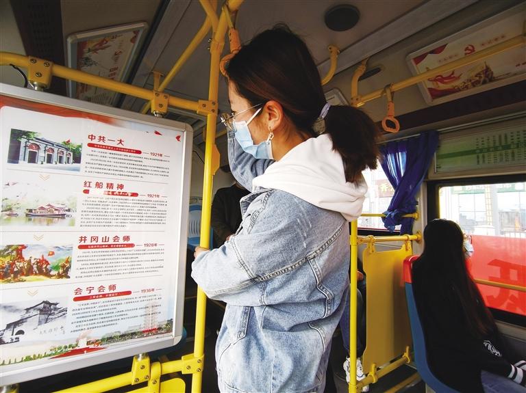 黨史學習教育主題車廂的車體外部掛有醒目的黨史宣傳標語,走進車廂,風道展板上以黨史故事的形式,圖文并茂、生動形象地展示著紅船精神、井岡山精神、長征精神、遵義會議精神、延安精神、西柏坡精神、抗美援朝精神、戰(zhàn)疫精神等內容。車廂內的座椅靠背、宣傳欄等處也印有不同的黨史宣傳知識,公交車廂成了黨史學習教育的流動“微課堂”。乘坐在黨史學習教育主題公交車上,乘客便可重溫中國共產黨波瀾壯闊的輝煌歷程,汲取民族復興的精神力量。