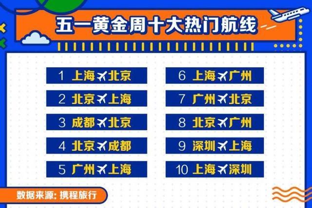 《報告》稱,今年五一期間,消費者跨省出游意愿強烈,攜程機票單日訂單量對比2019年同期最高增幅約28%。上海-北京、北京-上海、成都-北京、北京-成都、廣州-上海、上海-廣州、廣州-北京、北京-廣州、深圳-上海、上海-深圳為“五一”黃金周十大熱門航線。