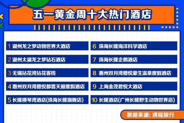 數(shù)據(jù)顯示,攜程酒店預訂間夜以及GMV在假期前三天連續(xù)突破平臺歷史峰值,對比2019年同期,單日訂單量增幅最高達70%。湖州龍之夢動物世界大酒店、湖州太湖龍之夢鉆石酒店、無錫拈花灣拈花客棧、惠州雙月灣檀悅都喜天麗度假酒店、長隆橫琴灣酒店(珠海長隆旗艦店)、珠海長隆海洋科學酒店、珠海長隆企鵝酒店、惠州雙月灣檀悅豪生溫泉度假酒店、上海金茂君悅大酒店、長隆酒店(廣州長隆野生動物世界店)為今年“五一”黃金周熱門酒店TOP10。