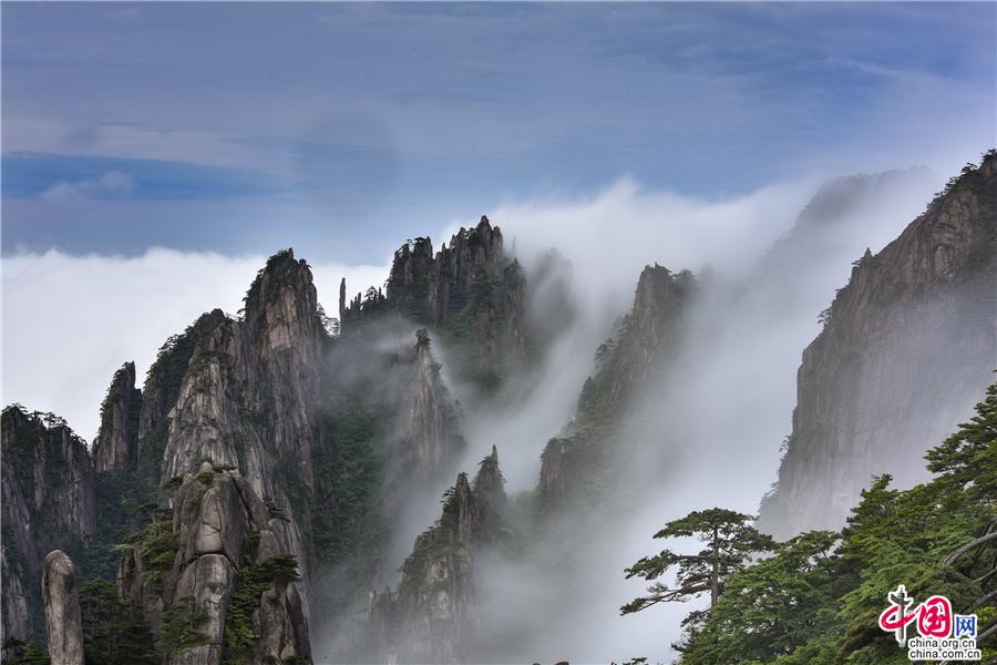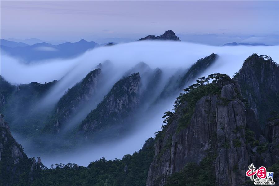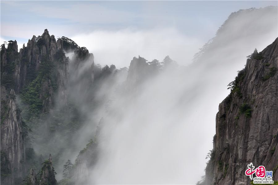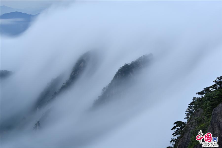 5月22日傍晚,雨后安徽黃山風(fēng)景區(qū)現(xiàn)壯觀的云海奇觀,見云海奔騰而來,越過北海的始信峰,沿著群峰傾瀉而下勢(shì)如瀑布之壯觀,在奇群、怪石和形態(tài)各異黃山松的作用下勾勒出一幅幅流動(dòng)的水墨畫;黃山不僅是云霧之鄉(xiāng),更是中國傳統(tǒng)水墨畫的天然的素材。(姚育青)