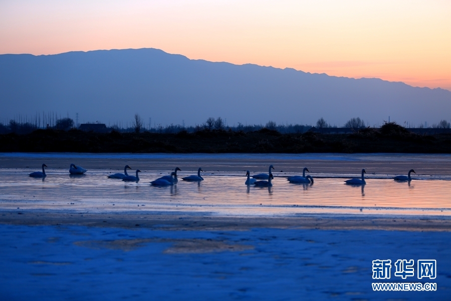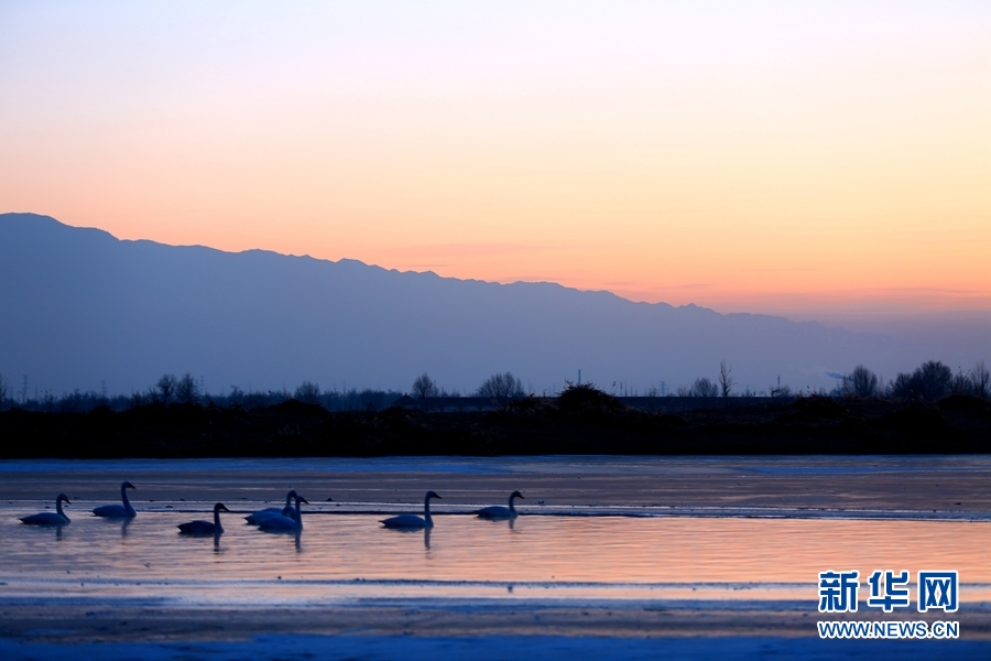 2022年1月2日,晨曦初露的甘肅省張掖市甘州區(qū)黑河流域,一群大天鵝在河中棲息、覓食,宛如一幅靜美的畫卷。新華網(wǎng)發(fā)(楊永偉 攝)