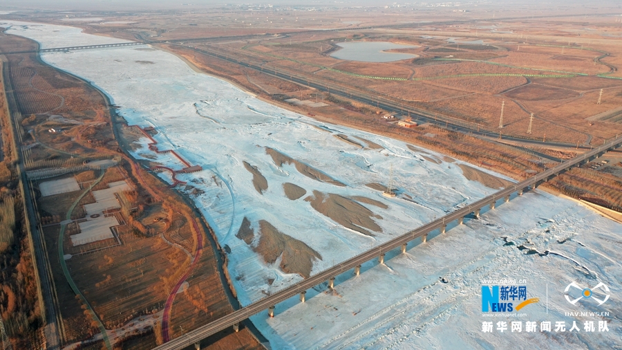 這是1月20日在甘肅省張掖市甘州區(qū)航拍的黑河。新華網(wǎng)發(fā)(楊永偉 攝)